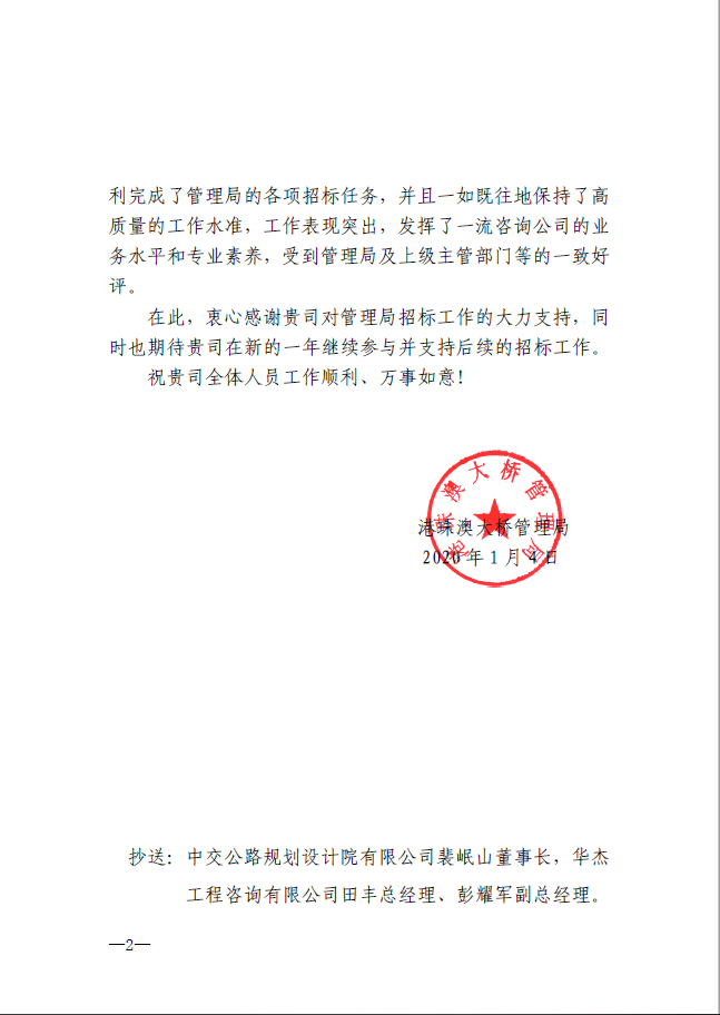 近日,公司收到業(yè)主單位港珠澳大橋管理局發(fā)來的感謝信。在港珠澳大橋主體工程建設(shè)期,公司提供了優(yōu)質(zhì)的項(xiàng)目管理和招標(biāo)咨詢服務(wù);大橋進(jìn)入運(yùn)營期后,公司繼續(xù)為大橋防洪影響后評估、東人工島旅游(藍(lán)海豚島)及配套設(shè)施開發(fā)總體策劃及概念設(shè)計(jì)、機(jī)電日常養(yǎng)護(hù)等項(xiàng)目提供了全過程的招標(biāo)代理服務(wù)。華杰公司招標(biāo)三部團(tuán)隊(duì)以高度負(fù)責(zé)、銳意進(jìn)取、求真務(wù)實(shí)的工作態(tài)度,一如既往地保持了高質(zhì)量的工作水準(zhǔn),獲得了業(yè)主的表揚(yáng)。