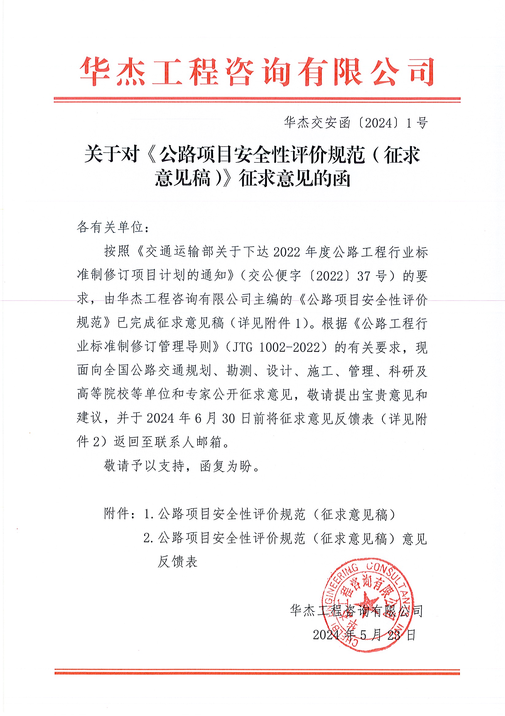 關于對《公路項目安全性評價規(guī)范(征求意見稿)》征求意見的函
